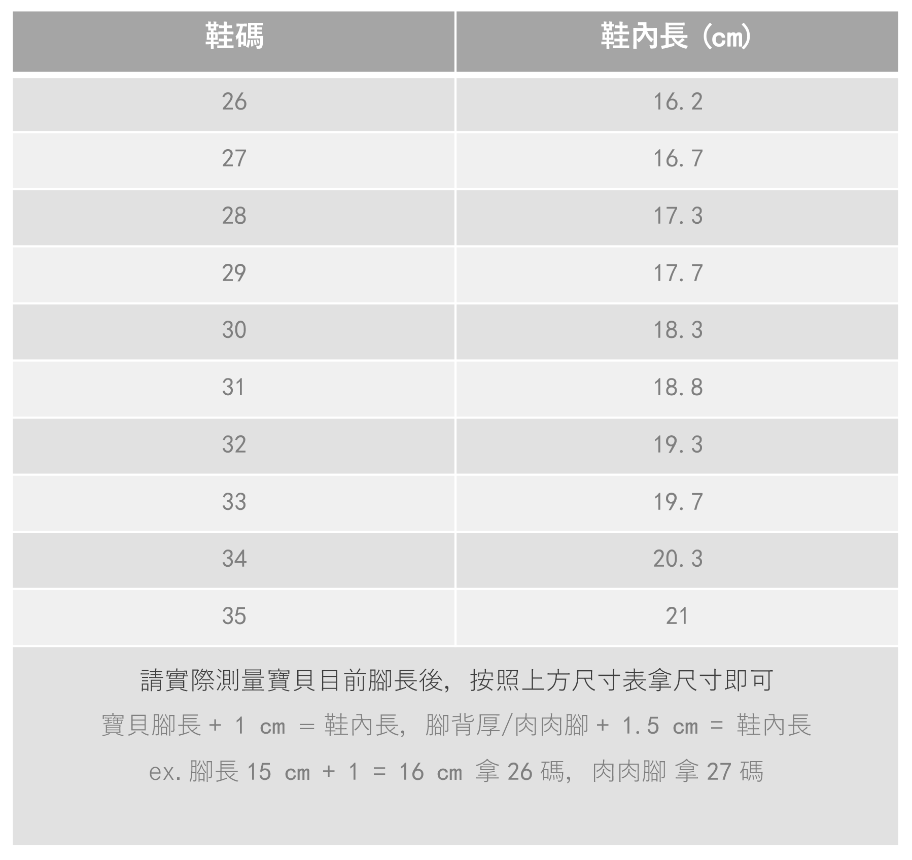 .寶貝腳長 + 1cm (下方有詳細尺寸表 )